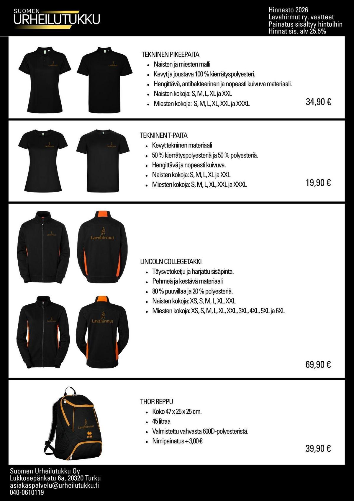 Lavahirmujen nimikkotuotteita (takit, paidat sekä vaihtuvat muut tuotteet) on nyt tilattavissa. Tilaukset tehdään itse suoraan Urheilutukkuun. Tuotteita on mahdollista käydä sovittamassa paikan päällä. Yhteystiedot alla.